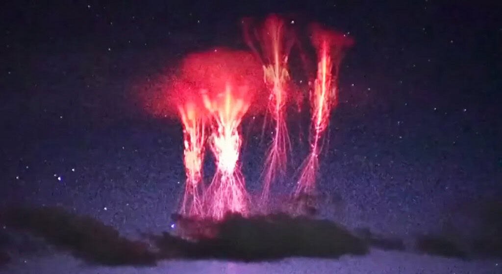 Uma descarga elétrica rara e intensa, chamada “sprite vermelho”, iluminou o céu noturno na cidade de Shannan, no Tibete, sudoeste