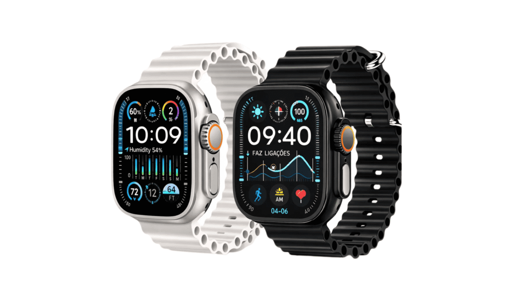 O Smartwatch Ultras 4 Series 11 49mm possui tela AMOLED, tecnologia que proporciona maior contraste e definição na exibição de