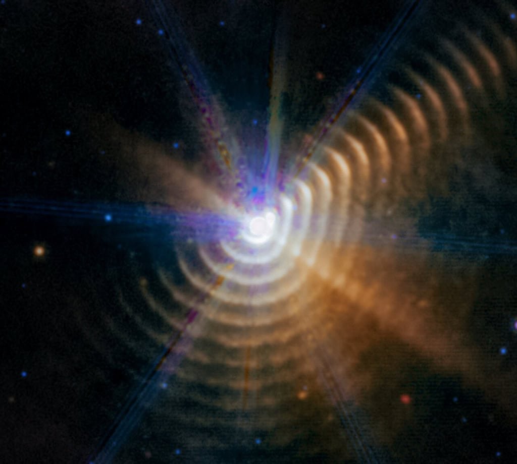 Pesquisadores utilizaram imagens do TelescĂłpio James Webb (JWST) para estudar a poeira cĂłsmica ao redor de estrelas em seus momentos