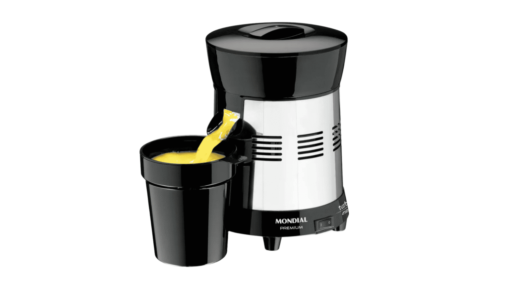 O Mondial E-10 Turbo Premium possui potĂŞncia de 250W, suficiente para extrair sucos de diferentes frutas e alguns vegetais utilizados